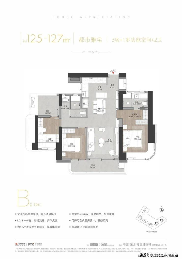 B户型:建面约125-127㎡,3+1房2厅两卫,竖厅、双龙抱珠结构,主卧套间设计、左侧次卧上方阳台可以改造为书房、儿童房均可,相较于A户型缺失的是居家静溢性,但它的可塑性更强,更加实用。·空间布局合理使用,采光通风俱佳· LDKB一体化,动线流畅,升华尺度约5.5m进深大主卧套间,享奢华美境·面宽约6.2m双开间大阳台,纵览美景·可开可合式厨房设计,舒朗明亮