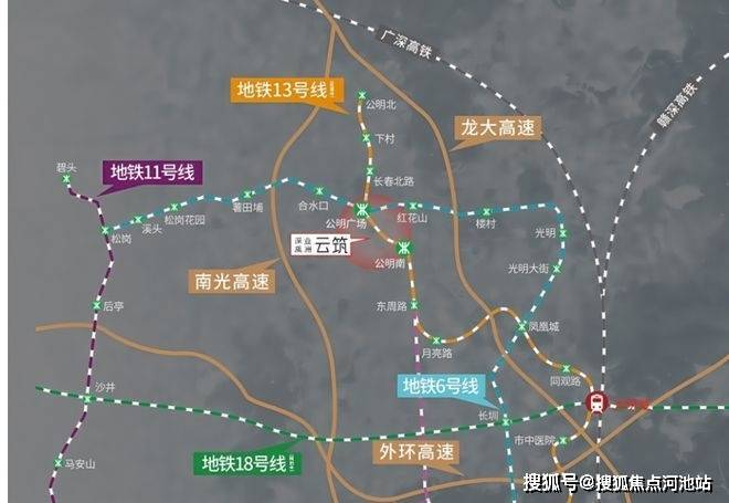 深业云筑,位于深圳市光明区公明街道马田街道石家社区,地处光明科学城大科学装置区,紧邻地铁6号线公明广场站(1.1公里)及在建13号线公明南站(约700米),未来可直达南山科技园、后海总部基地;周边龙大、南光高速无缝衔接福田、南山,交通便捷。