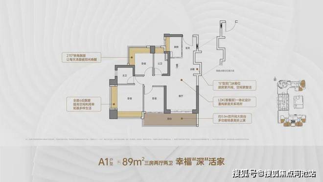 89㎡的3房2厅2卫,A2户型,设计的是竖厅格局,客厅3.5米开间,LDKB一体化,S墙设计预留冰箱卡槽位,客厅连接次卧出5.9米长的大阳台,次卧270度转角飘窗,U型厨房,卫生间干湿分离,阳台有朝西向、东向、南向。