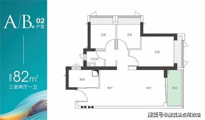 A/B座02户型-建面约82m² 三房两厅一卫