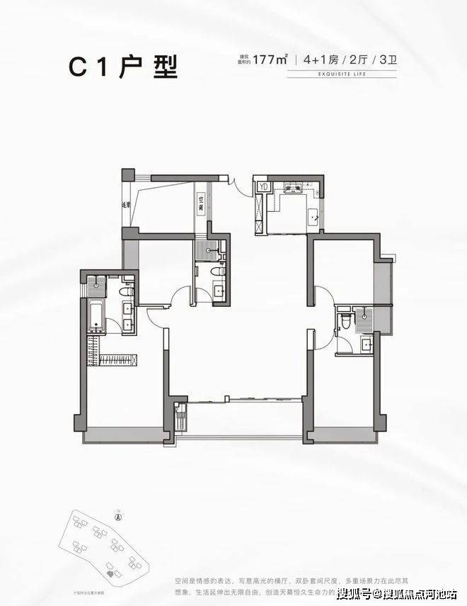 177平:5房2厅3卫,西南朝向,使用率77.43%(不包含赠送)