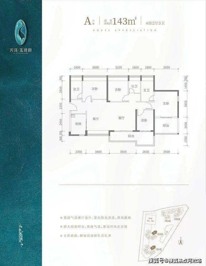 A户型-143㎡-4房2厅3卫,设计的是横厅南北通透格局,客餐厅开间7.3米,超大观景阳台6.5米长,全屋飘窗设计,主卧套房设计。