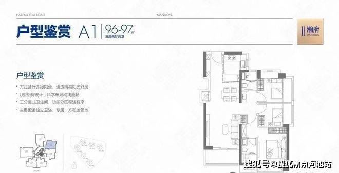 96-97㎡的3房2厅2卫,A1户型/2栋2单元02,设计的是竖厅格局,客厅3.5米开间,LDKB一体化,S墙设计预留冰箱卡槽位,动静分区,三开间朝南,双次卧东北向,得房率约78%(不含赠送),U型厨房,公卫三段式分离,东南朝向。