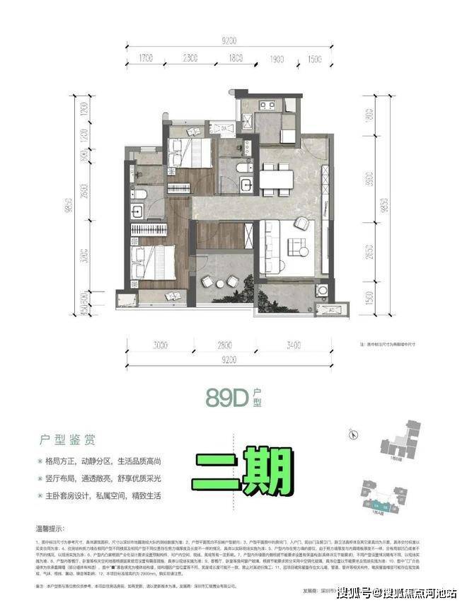 89㎡的3房2厅2卫(二期D户型),设计的是经典竖厅格局,餐客厅一体化,客厅3.4米开间,三开间朝南,3个卧室分别做到了3米/2.8米/2.3米的宽度,U型厨房,阳台1.5米进深,得房率:72.96%(不含赠送),西南朝向。