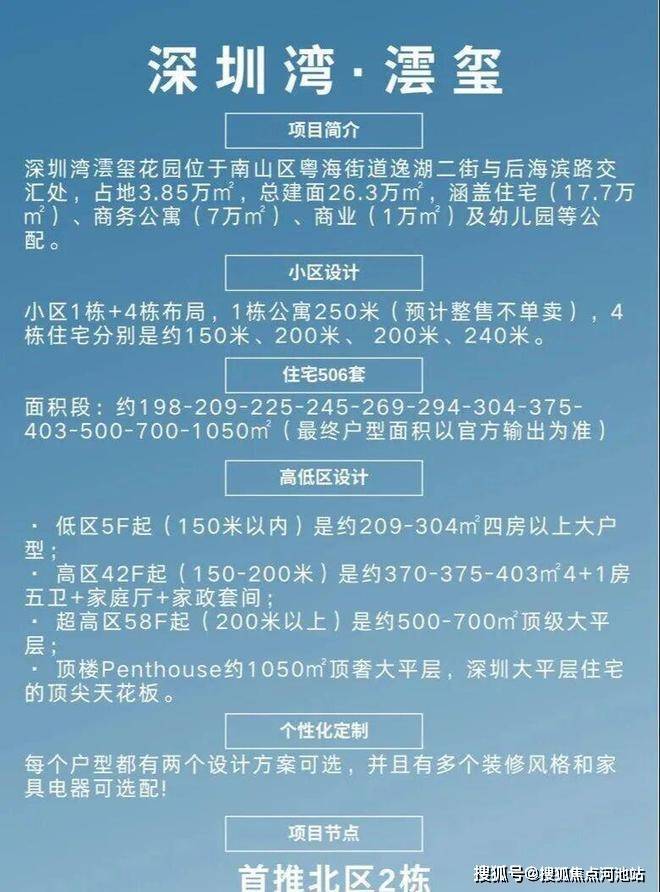 项目共5栋楼其中4栋住宅1栋公寓,后海澐玺花园可售住宅货量约505套,首推北区2栋楼。