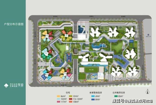 山水东城,由深圳国企深业集团打造,总占地面积约6.7万㎡,总建筑面积约44.9万㎡,容积率4.6,绿化率35%,分2期开发,共规划有13栋总高32-49层的住宅,共分两个地块,但是花园是在一起的,没有隔开。