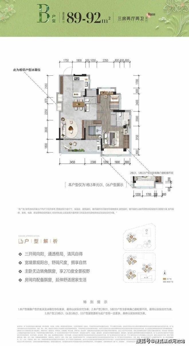 招商会展湾雍境二期首次推首北地块1栋3单元,约80-92㎡ 3房,共195套,新规使用率高达96%-105%!
