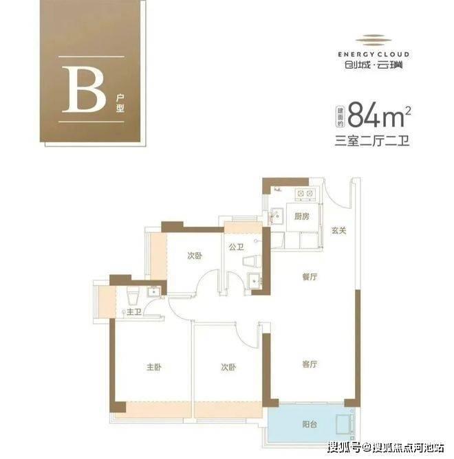 -84㎡3房2厅2卫:设计的是竖厅格局,LDKB一体化设计,客厅3.4米开间,U型厨房,卫生间干湿分离,阳台有正东、西北、东北、东南、西南朝向。