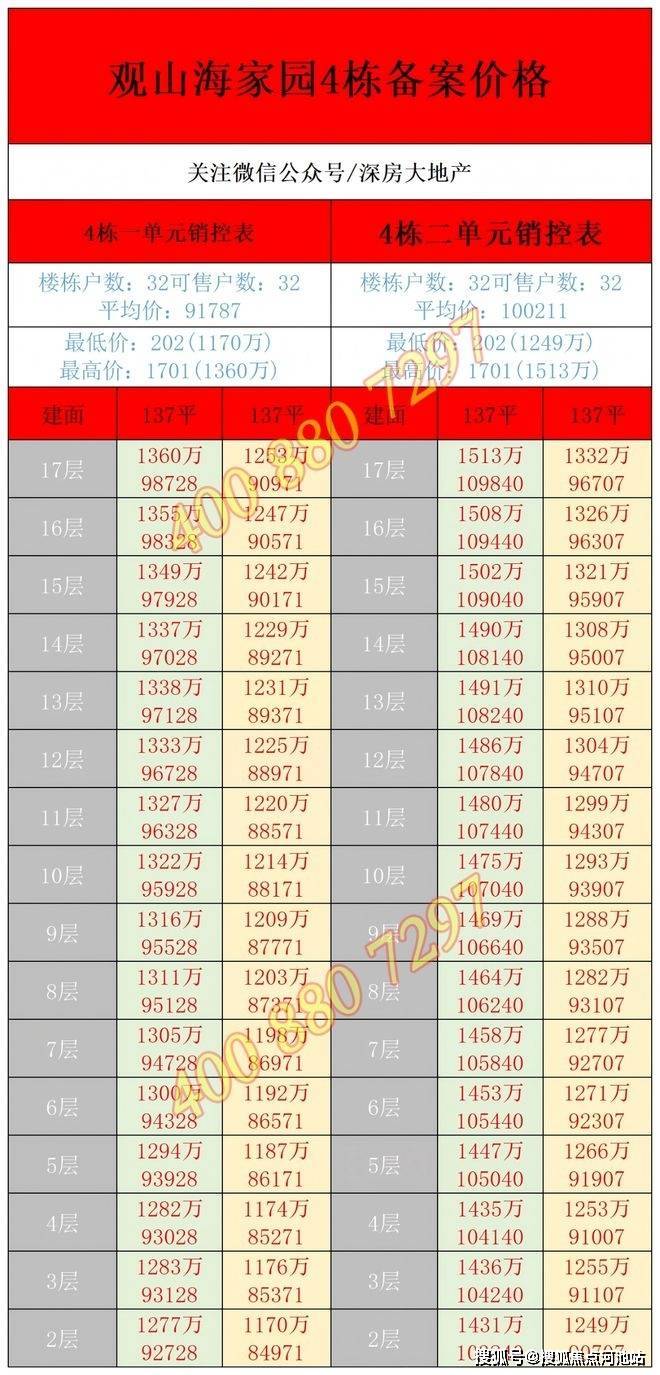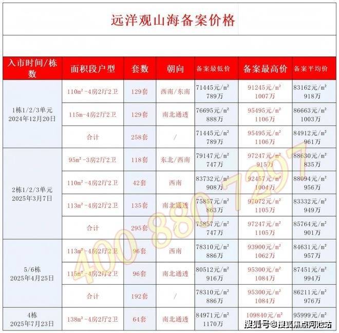 本次观山海家园楼盘取证加推的4栋备案均价9.6万/㎡,备案单价8.49-10.98万/㎡,总价在1170-1513万/套。