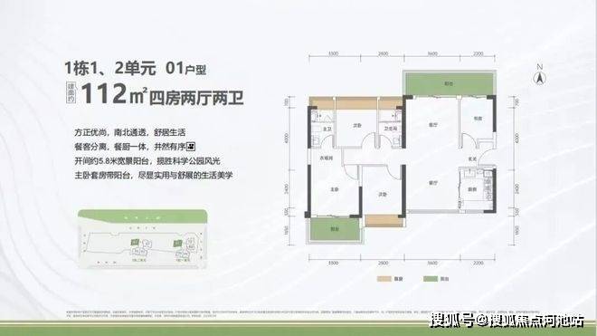 竖厅南北通透格局,进门入户玄关,客厅3.6米开间,餐客分离,餐厨一体设计,四开间朝南,主卧套房带阳台,客厅连接次卧出5.8米长的巨幕大阳台,U型厨房,卫生间干湿分离,阳台主朝东北向看科学公园,加上赠送后得房率约94.37%。