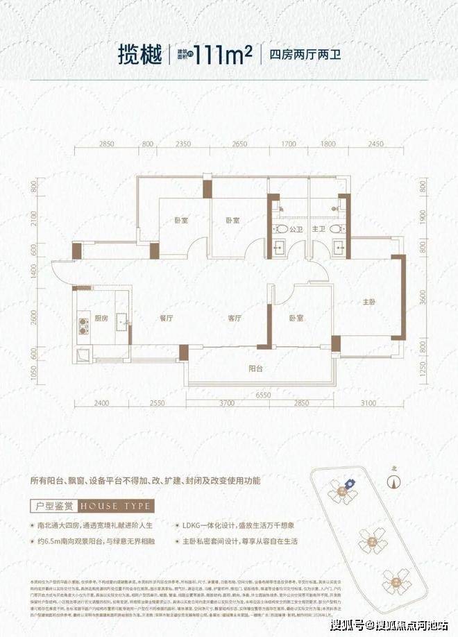 111㎡的4房2厅2卫,设计的是横厅南北通透格局,独门独户,进门入户玄关,客餐厅6.25米开间,LDKB一体化,全屋10面飘窗,主卧南北通,分别做到了主卧16.6㎡/次卧10.54㎡/次卧9.27㎡/次卧7.41㎡(包含墙体飘窗),U型厨房,卫生间干湿分离,得房率约102%(包含赠送),客厅连接次卧出6.55米长的大阳台,约10.8㎡主朝东南向。