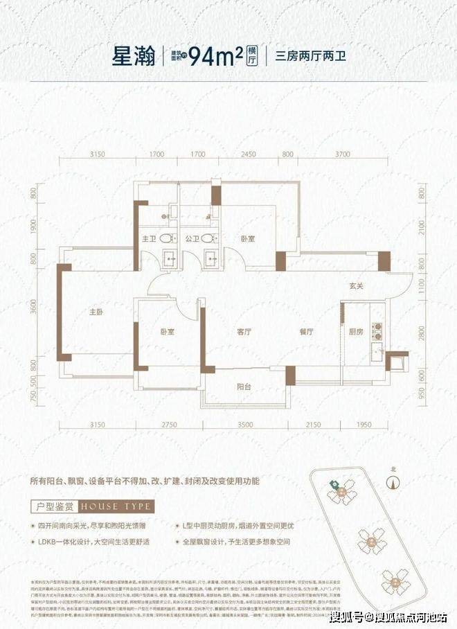 94㎡的3房2厅2卫(竖厅),设计的是经典竖厅格局,进门入户玄关,客厅3.5米开间,LDKB一体化,S墙设计预留冰箱卡槽位,动静分区,三开间朝南,分别做到了主卧17.35㎡/次卧10.5㎡/次卧9.45㎡(包含墙体飘窗),U型厨房烟道外置,公卫三段式分离,还带1个设备平台,得房率约100%(包含赠送),阳台约5.42㎡东南朝向。