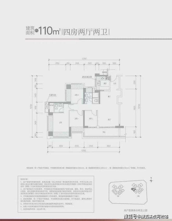 -110㎡的4房2厅2卫,设计的是经典竖厅格局,客厅3.8米开间,进门独立玄关,LDKB一体化设计,S墙设计预留冰箱卡槽位,4个卧室分别做到了3.8米/3.2米/2.55米/2.44米的宽度,U型厨房,公卫三段式分离设计,得房率约:95%(包含赠送),客厅连接次卧出6.2米的大阳台,朝西南向。