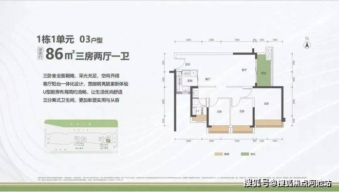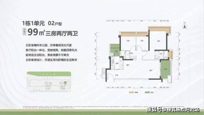 竖厅格局,客厅3.5米开间,LDKB一体化设计,进深11.31米,动静分区,三卧室朝东北向看科学公园,二字型厨房还带1个生活阳台,公卫三段式分离,阳台1.5米进深,东南朝向,加上赠送后得房率约92.7%。