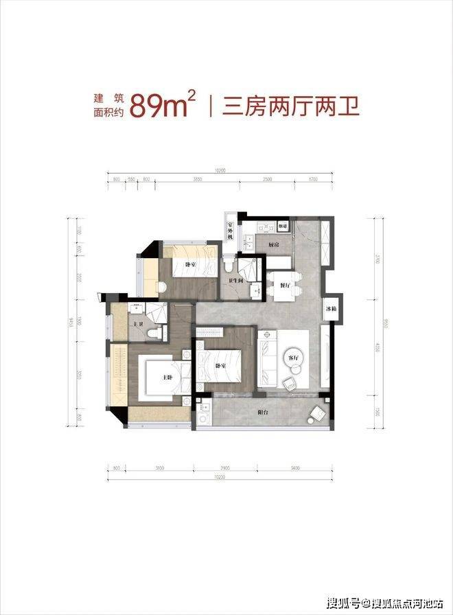 89㎡的3房2厅2卫,设计的是竖厅格局,客厅3.4米开间,LDKB一体化,S墙设计预留冰箱卡槽位,3个卧室分别做到了3.9米/2.9米/2.6米的宽度,客厅连接次卧出6.3米长的大阳台,L型厨房,卫生间干湿分离,有西北、西南或东南朝向。