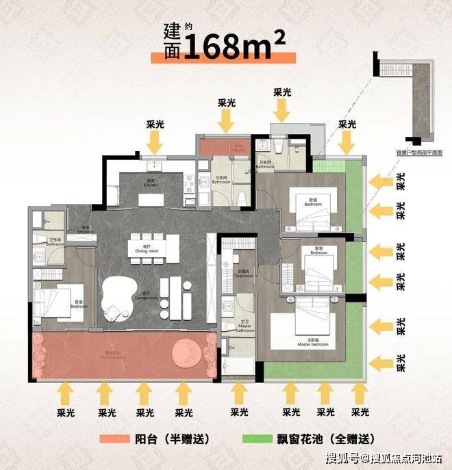 约168㎡四房四卫户型:东南向一线亲海大平层,更是奢配豪华奢阔三套间,以及含家政间、生活阳台的五分离卫浴。近9米大阳台,约35㎡奢华主卧,尺度越级,私密与从容兼备,尽显世家生活排场。