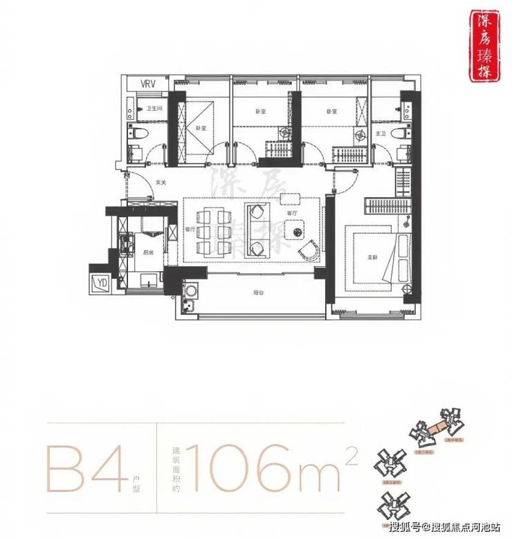 106㎡的4房2厅2卫,B4户型,1栋1/2单元05户型,设计的是横厅南北通透格局,进门入户玄关,LDKB一体化设计,四开间朝南,主卧大套间设计,全屋7面飘窗,客餐厅出大阳台,U型厨房,卫生间干湿分离,得房率约72%(不含赠送),阳台主朝东南向。