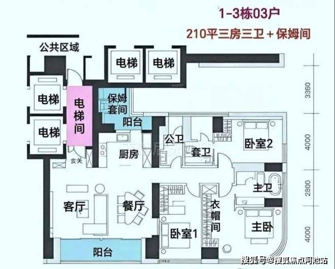 每户都是专梯入户+入户空间。C栋位于小区最里面,东南向户型(218㎡01)会被A、B栋遮挡。