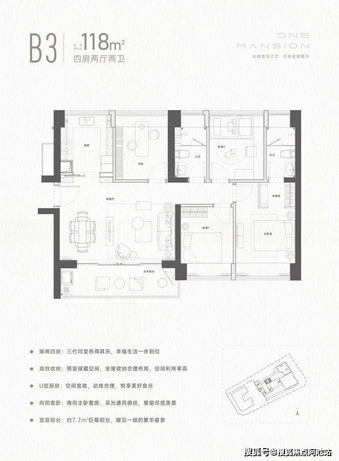 建面约118㎡的4房2厅2卫,拥有独立门户,是项目的“楼王”产品。四居室可以容纳三代同堂,各得其乐。南向大主卧套房,采光通风俱佳,推窗尽览美景;大宽景阳台足足约7.7m²,完全就是一个“多功能区”的配置,想要阳光房、玩具屋,还是茶室?都可以随心实现呦。