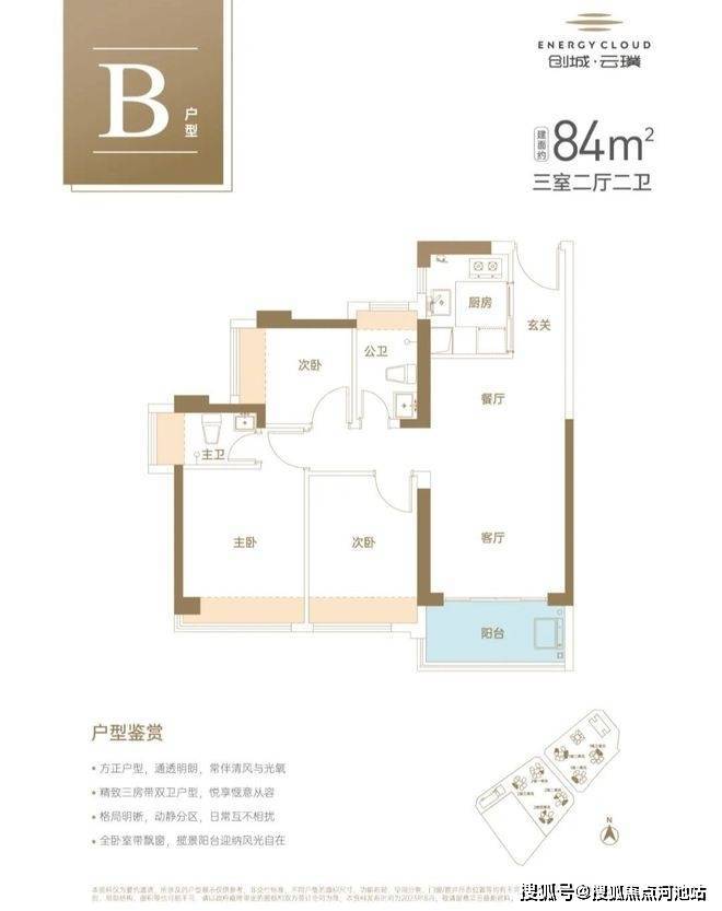 84㎡的3房2厅2卫,设计的是竖厅格局,进门入户玄关,客厅3.4米开间,LDKB一体化设计,动静分区,3个卧室分别做到了主卧10.45㎡/次卧8.76㎡/次卧5.39㎡(实测面积,去掉墙体),U型厨房,卫生间干湿分离,得房率约73.29-73.86%(不含赠送),西北、东北、东南或西南朝向。