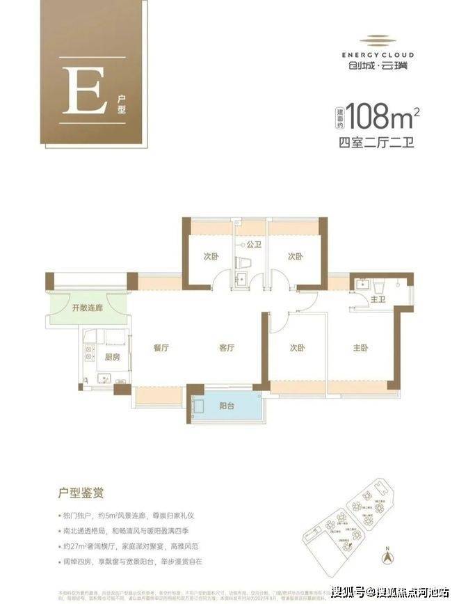 -108㎡4房2厅2卫:设计的是横厅南北通透格局,客餐6.2米开间,U型厨房,卫生间干湿分离,有额外赠送一大块入户花园,阳台主朝东南向,仅有2栋4单元03户型才有这个面积段户型。