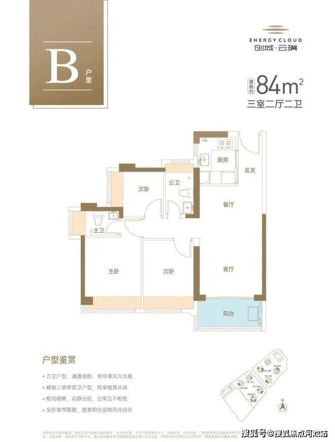 -84㎡3房2厅2卫:设计的是竖厅格局,LDKB一体化设计,客厅3.4米开间,U型厨房,卫生间干湿分离,阳台有正东、西北、东北、东南、西南朝向。