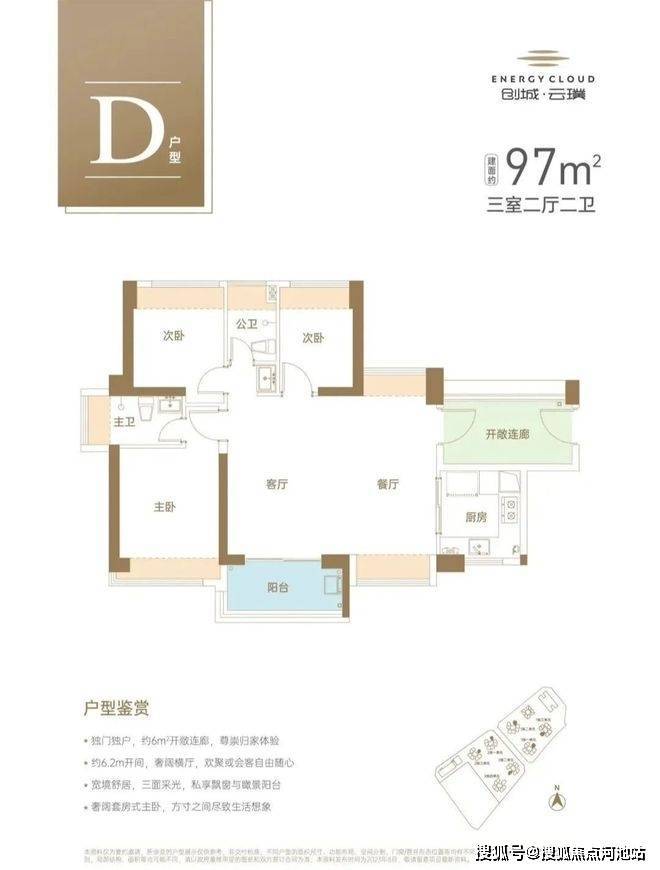 -97㎡3房2厅2卫:设计的是横厅南北通透格局,客餐厅6.2米开间,U型厨房,卫生间干湿分离,有额外赠送一大块入户花园,阳台主朝东南向。