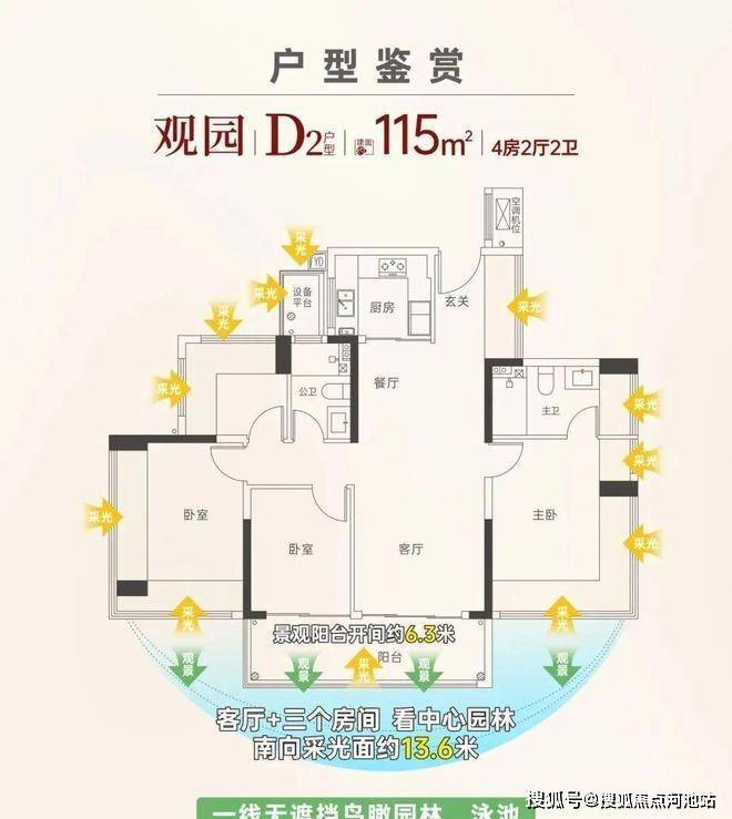 166㎡四房两厅两卫:南北双阳台设计,主卧270°大飘窗,客厅面宽约6.2米,五开间朝南,空间尺度感媲美豪宅;