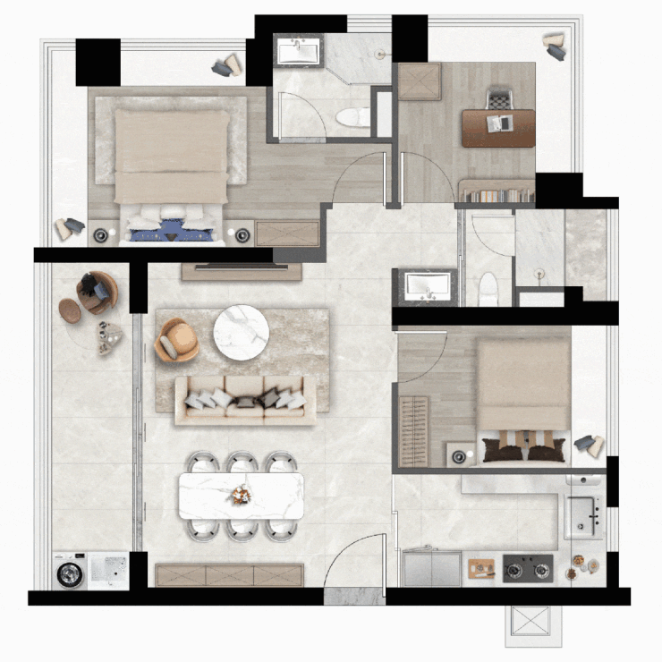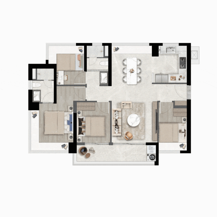空间的巧思不止于厨房。部分户型中客厅与次卧采用非承重墙隔断,实现了“四居”与“大三居+阔厅”的自由切换。这种可生长的空间结构,让家的格局能伴随孩子的成长、父母的到来而灵活调整,真正实现全生命周期的居住适配。