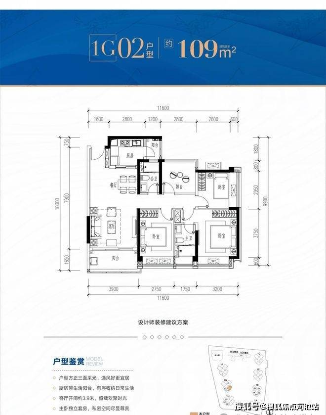 109平4房2卫,竖厅格局,南北通透/东南朝向,赠送面积14.41-16.43㎡,加赠送后得房率约92.82-94.67%。
