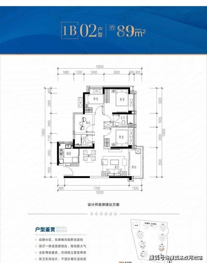 89平4房2卫,竖厅格局,赠送面积约11.85-15.02㎡,加赠送后得房率约93-96.48%。
