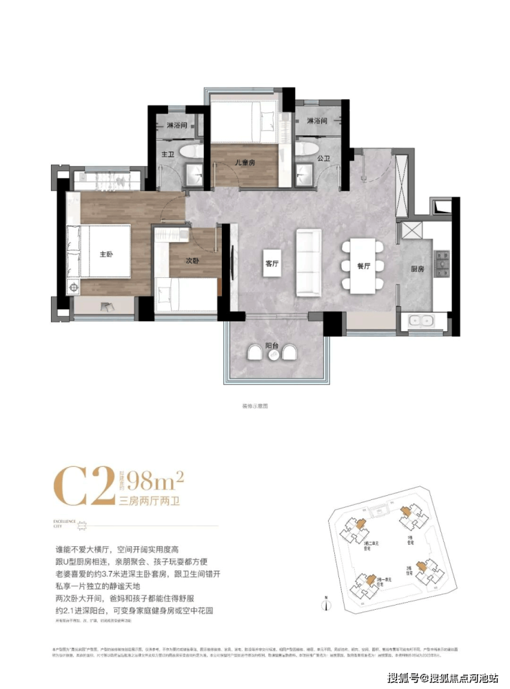 户型设计非常人性化,如三房的阳台都有2米开间,洗手间“三分离”设计,卧室设计270度景观卧室,推窗见山景。而且户型实用紧凑,68平米2房户型即可满足2个年轻人+1个老人+1个小孩居住,可满足刚需10年居住教育需要。