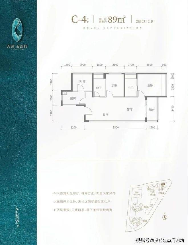 B2户型-111㎡-4房2厅2卫,设计的是竖厅南北通透格局,客厅4.2米开间,阳台主朝东北朝向,看花园景观,全屋飘窗设计。
