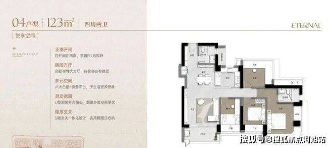 123m²的4房2厅2卫,设计的是经典竖厅格局,客厅4.2米开间,LDKB一体化弹性大方厅,S墙设计预留冰箱卡槽位,四开间朝南,动静分区,主卧套房270°环幕凸窗,六大凸窗+设备平台,分别做到了主卧20.36㎡/次卧10.14㎡/次卧10.04㎡/次卧8.14㎡(实测面积,去掉墙体),U型厨房,卫生间干湿分离,得房率超90%(包含赠送),正南朝向,看皇岗公园。