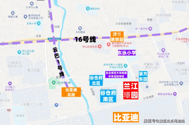 兰江璟园,位于坪山区石井街道比亚迪路豪方东园西侧,项目南侧是坪山比亚迪厂区,还有比亚迪六角大楼,西侧是方直谷仓府,北侧紧挨着东北师范大学附属中学深圳学校,16号地铁线“沙壆站”距离约400米。