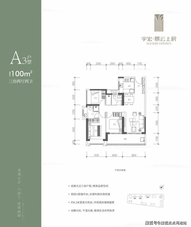 100㎡的3房2厅2卫,设计的是竖厅格局,客厅3.6米开间,LDKB一体化,三开间朝南,3个卧室分别做到了3.1米/2.6米/2.4米的宽度,客厅连接次卧出6.2米长的大阳台,U型厨房,卫生间干湿分离,得房率约76%(不含赠送),东南朝向。