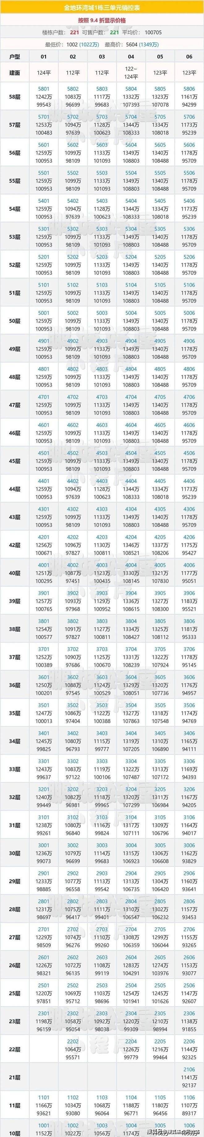 总价区间:1100-1436 万左右,4梯6户(共58层) 按揭94折,一次性93折