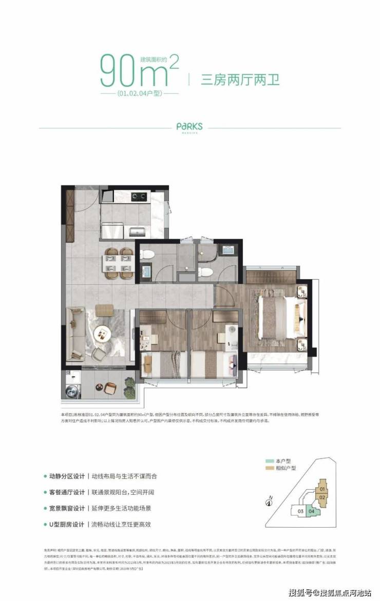 建筑为98.5米高32F两梯四户的独栋塔楼,车位比是1:0.82. 整栋只有120套住宅,供应90套约90㎡三房二卫(856-1018万) 和 30套约117㎡四房二卫(1292-1442万)。