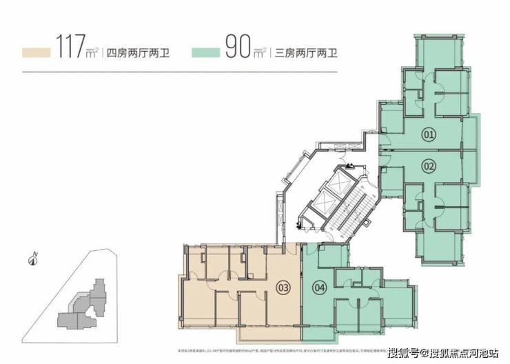 该户型为传统竖厅三房二卫设计,分布在01/02/04户,与常规的同面积户型没有太大区别,亮点在于主卧是个南北通设计。