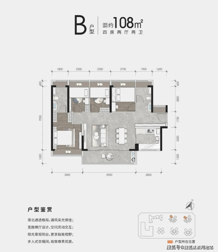 108㎡户型做的是横厅,动静分区,四房两厅一厨两卫一阳台的格局,这种户型最近几年非常常见了,优点就是横厅显得客厅更宽,有宽景阳台,室内通透性略好一些。