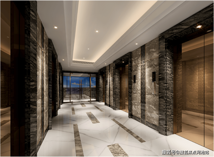 进入大堂电梯厅,迎面而来的是多线条样式的天花板,宛如波光粼粼的湖面,搭配米黄大理石拼花地面。