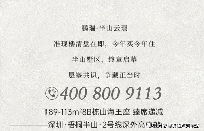 如需了解本楼盘更多详情,欢迎来电咨询深圳盐田鹏瑞·半山云璟开发商售楼处免费400咨询/预约电话:400-800-9113(已认证)中介请勿扰,因近期参观的人员太多,本项目营销中心暂不接受临时到访,为不耽误您的行程,过来楼盘现场参观样板房请务必记得提前来电预约,预约看房的话最终房价还能更加优惠,最终价格包您满意!