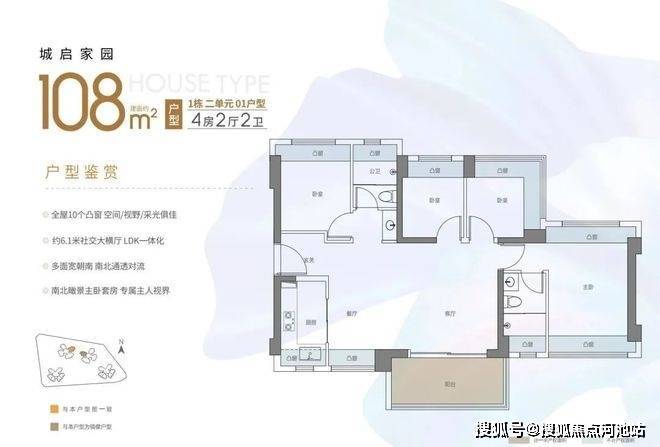 108㎡的4房2厅2卫,西南或东南向,横厅南北通透格局,进门独立玄关,客餐厅6.1米开间,主卧双飘窗通透设计,全屋10个凸窗,飘窗+阳台使用率在90%左右。