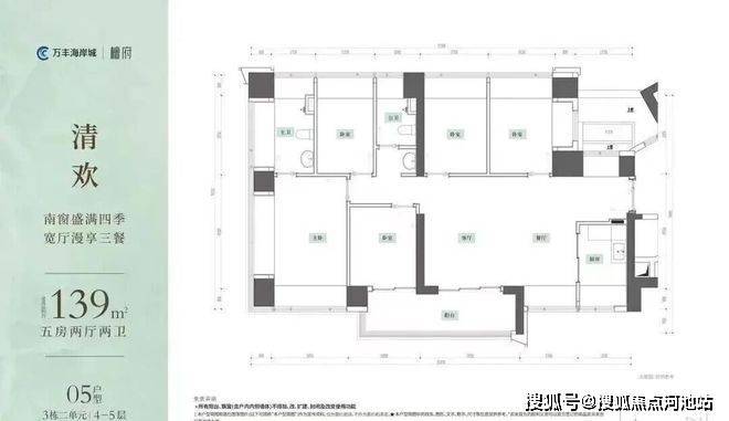 139㎡的5房2厅2卫,设计的是横厅南北通透格局,客餐厅6.25米开间,LDKB一体化,全屋12面飘窗,U型厨房,公卫三段式干湿分离,得房率约100%(包含赠送),客厅连接次卧出6.8米长的观景大阳台约11.9m²东南朝向。赠送面积约29.47m²。