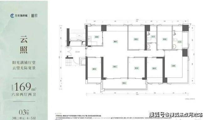 169㎡的6房2厅2卫,设计的是竖厅南北通透格局,独门独户,赠送私用公区走道,客厅4.15米开间,餐客厅分离设计,五开间朝南,U型厨房,公卫三段式干湿分离,得房率约100%(包含赠送),7.05米长的超大观景阳台约12.33m²主朝东南向。赠送面积约31.69m²。