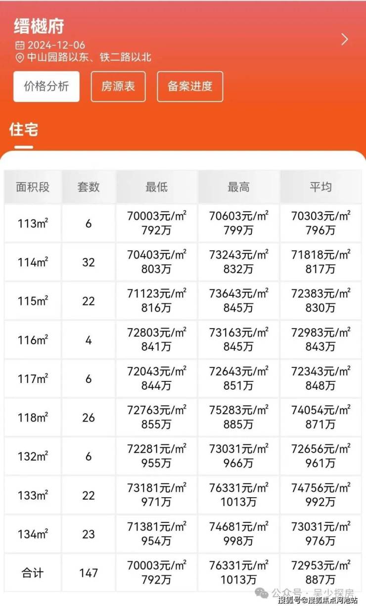 项目本次开盘首推住宅套数147套,建面约114-115-118-133㎡4-5房,开盘约93折,折后均价6.79万/㎡,单价6.51-7.1万/㎡,总价737-943万/套,精装修交楼。