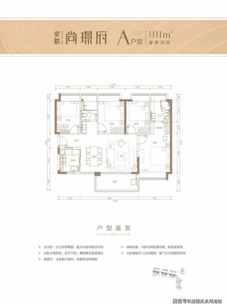 建面约111平4房,户型方正、大飘窗、全明户型、宽敞双卫设计,空间感好,功能性强,适合多人口家庭上车。