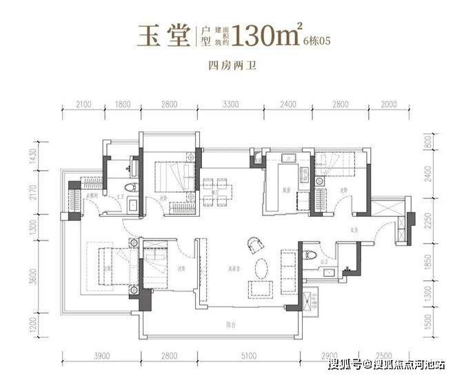 130㎡的4房2厅2卫,竖厅南北通透格局,独立玄关,客厅5.1米开间,客餐厅分离化设计,主卧270°无柱转角飘窗+衣帽间,分别做到了主卧23.66㎡/次卧11.2㎡/次卧8.96㎡/次卧7.84㎡(包含墙体飘窗),U型厨房烟道外置,得房率约101.95%(包含赠送),客厅连接次卧出超大阳台约14.09平,东北朝向。