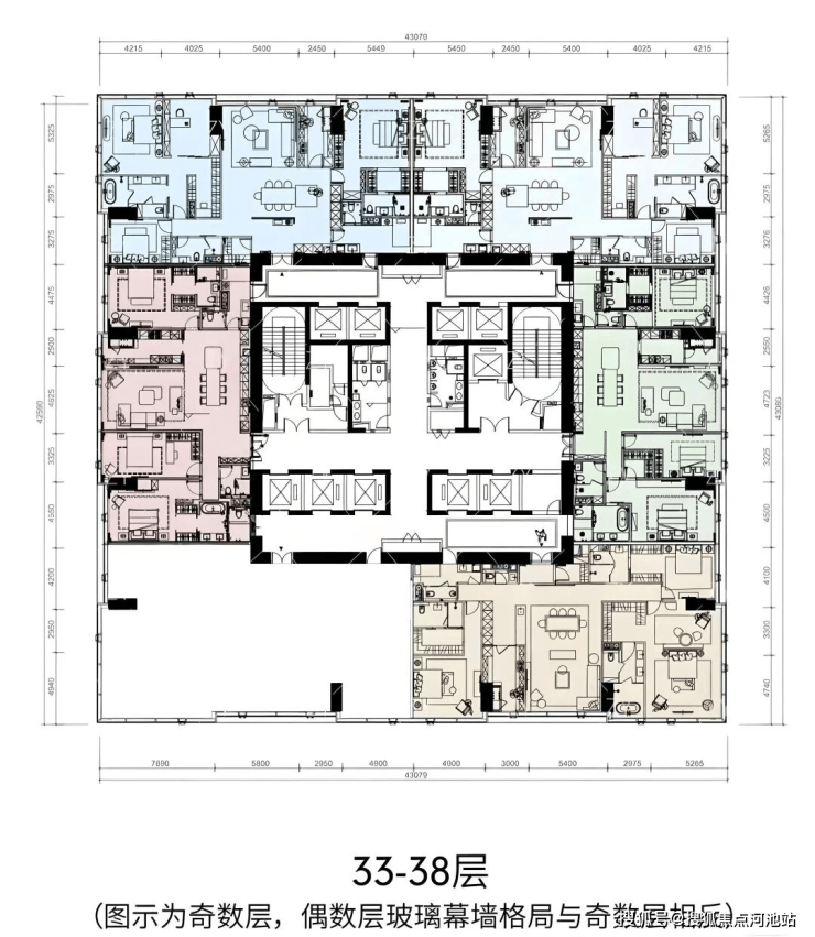 468㎡五房三厅六卫:位于1栋一、二单元高区33-38层,一层一户,仅6席。五房四套房设计,主卧L形全景落地窗,270°最佳观海位,南向超大三厅一体,动静分区布局有序。