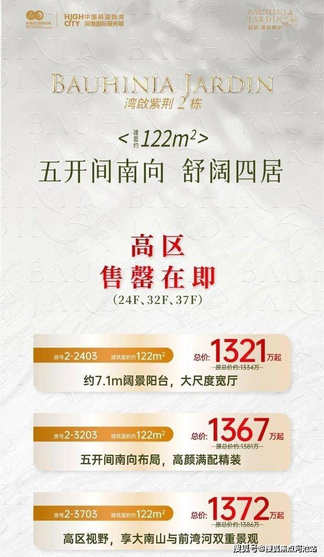 湾啟紫荆府位于前海妈湾听海大道,占地约1.5万㎡,住宅建面约6.6万㎡,容积率5.14,共有三栋住宅组成,层高36-37F,共485户,车位595个,车位比1.1.2,4梯5户,主推约96㎡稀缺三房、111㎡3+1房、122㎡四房、142㎡四房。户型设计了大客厅、宽景阳台、阔景飘窗等,拥有山海河多重景观资源,计划品质精装交付。户型采用建筑新规设计,户户大阳台,4梯5户,分布式电梯设计,独立电梯厅。
